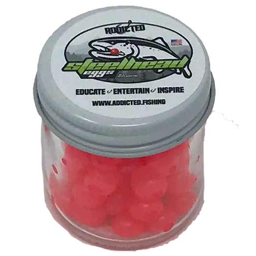 Introducing Addicted Trout & Steelhead Eggs. Designed and tested trout in lakes, trout in rivers/creeks, and summer/winter steelhead. You can fish these like a traditional bead, bobber dogged, drifted, under a trout float, or these eggs add that irresistible profile to just about any lure or bait. We like to scent the jar and tip our jigs with different color eggs to add extra attraction. The eggs come unscented, but add any of your favorite scent to make them irresistible to whatever fish your targeting.