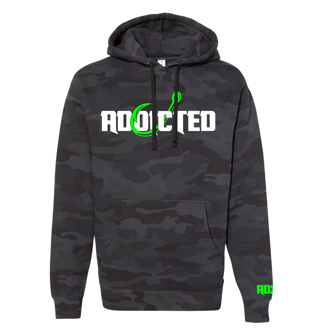This super comfortable and warm black camo hoodie features our Addicted logo on the front with a super sick neon green hook! We also have ADX printed in neon green down by cuff. Stay warm this winter