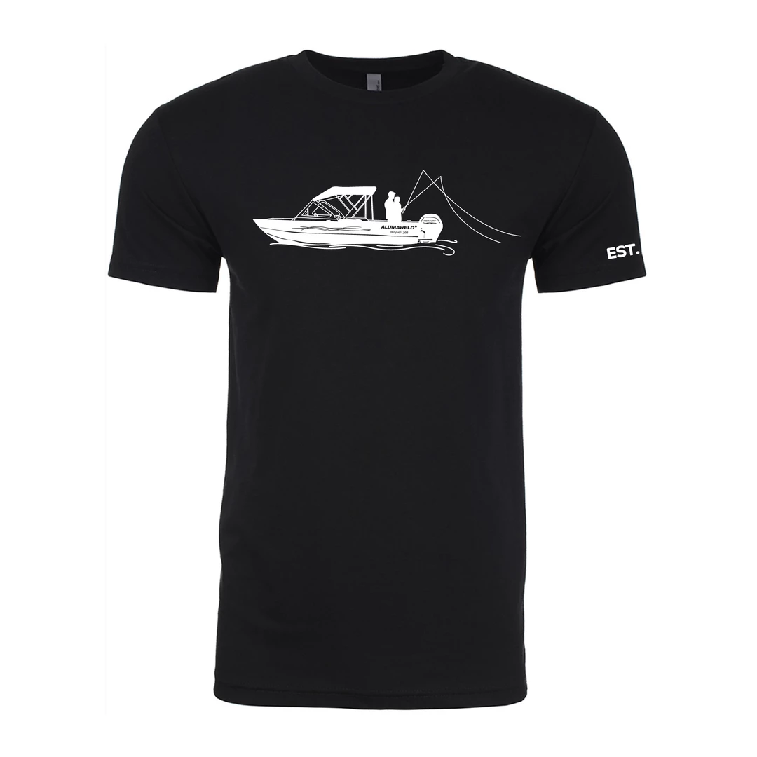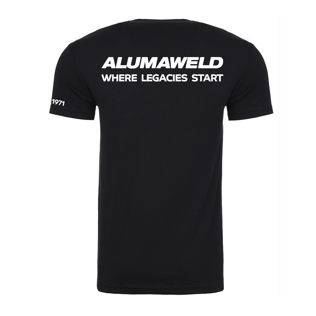 Alumaweld Stryker Legacy Shirt is on an all black shirt with the Stryker boat in white on the front of the shirt. The Alumaweld logo is in white on the back, with the text “Where Legacies Start”. We also printed est. 1971 on the sleeve.