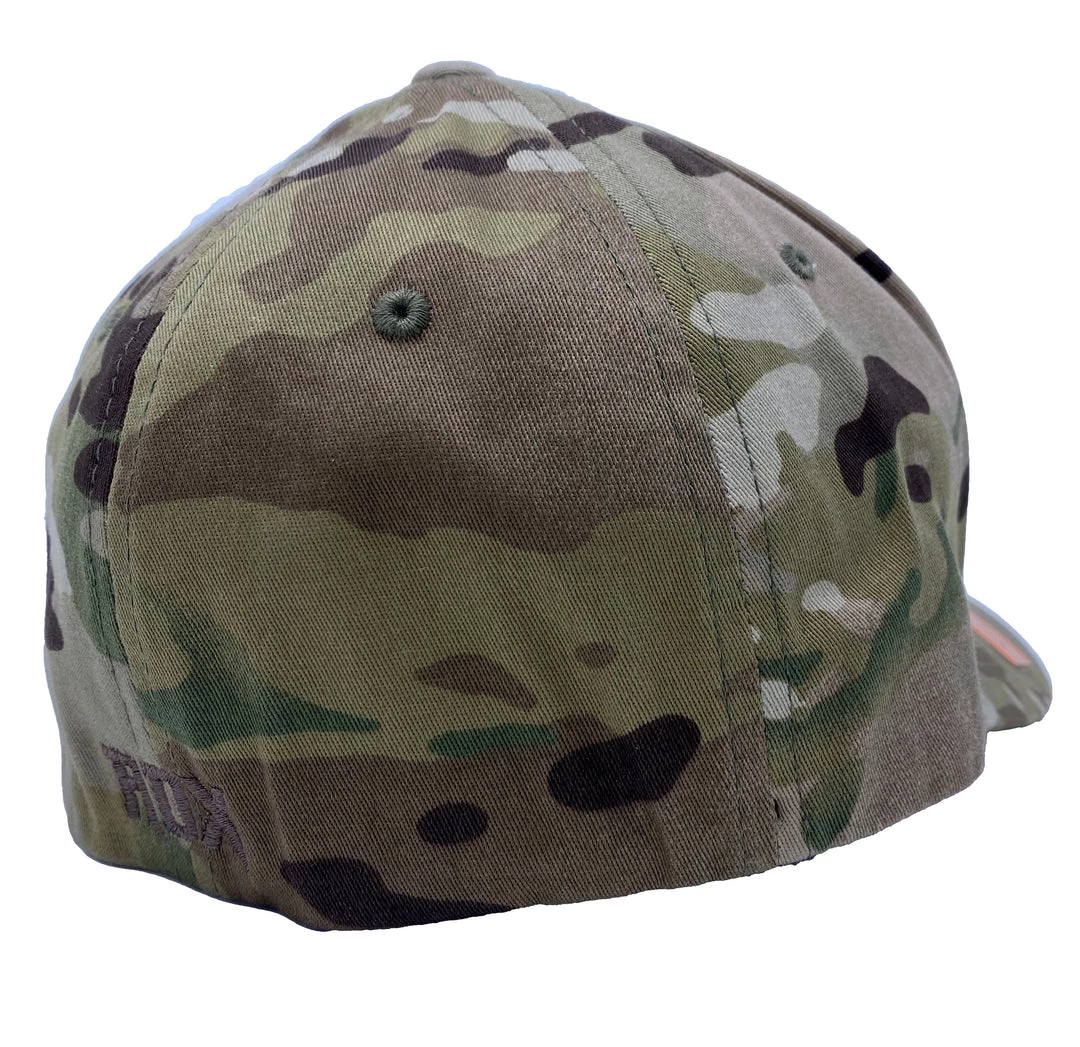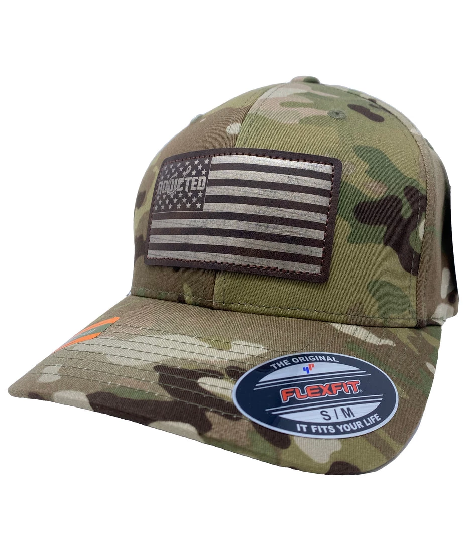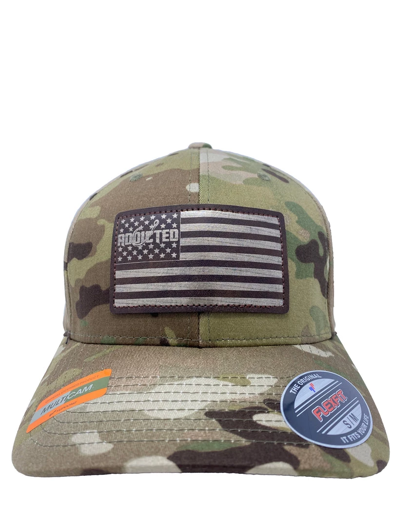 The Addicted Flag trucker continues to be one of the most popular styles. This rendition features a brown and gold patch on a desert camo flexfit hat.