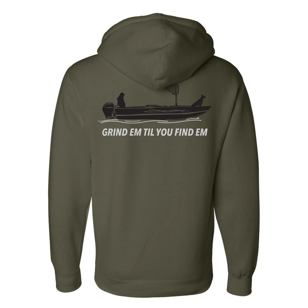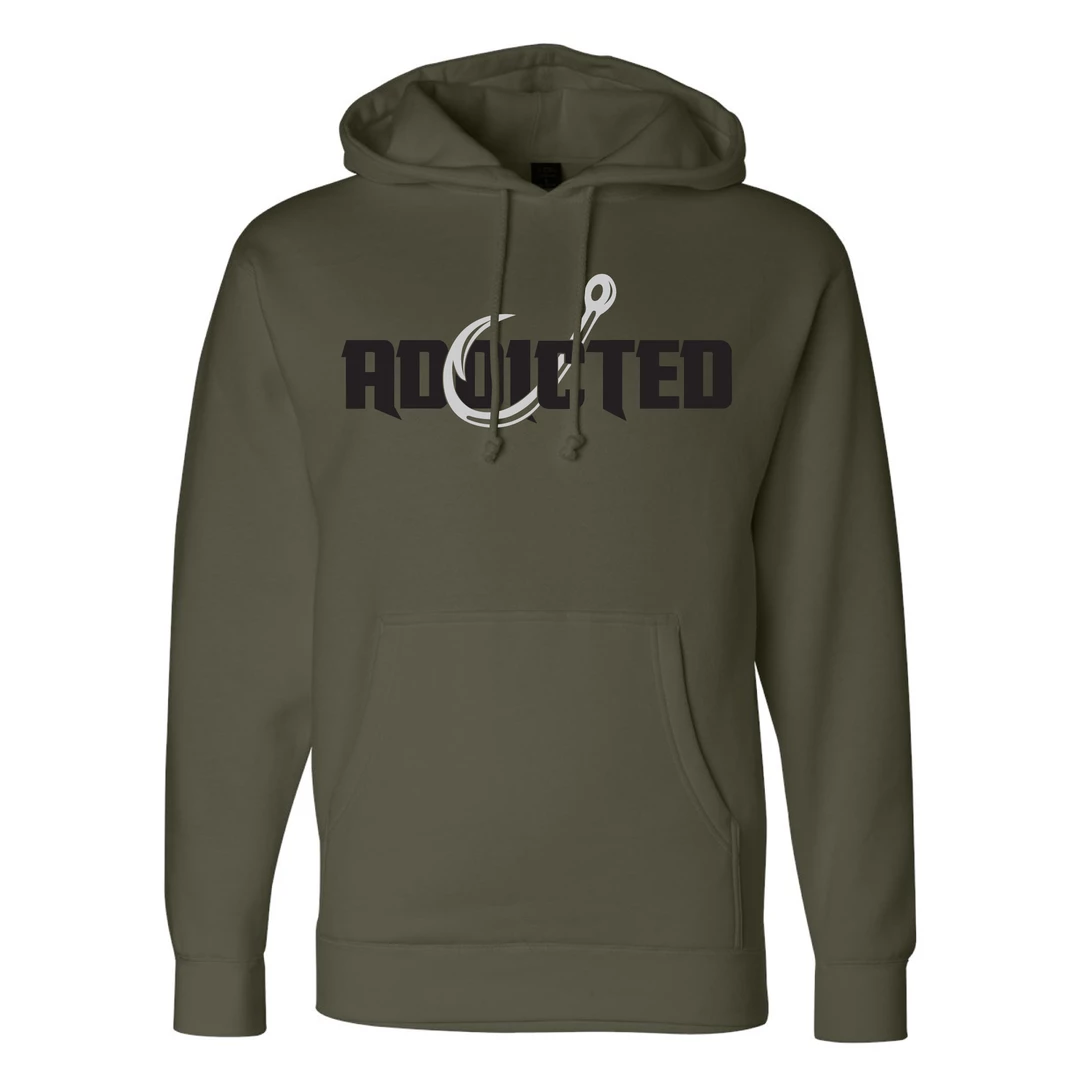 Printed on an army green high quality and warm hoodie, the grind em til you find em logo is featured on the back. This silhouette has Jordan & Little as features! The front of the hoodie has our Addicted logo in black/silver.