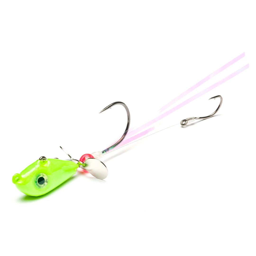 A shad style head with two-line tie points for vertical and horizontal presentations, this unique Addicted Fishing jig features a propeller spinner on the shank that provides built-in action, flash and a bubble trail in the water. A setback stinger hook is part of the integrated package – perfect for tipping with a nightcrawler or soft plastic. Jig head molded onto at 32746NP-BN. The 92553NP-BN stinger hook is setback by 1.5″